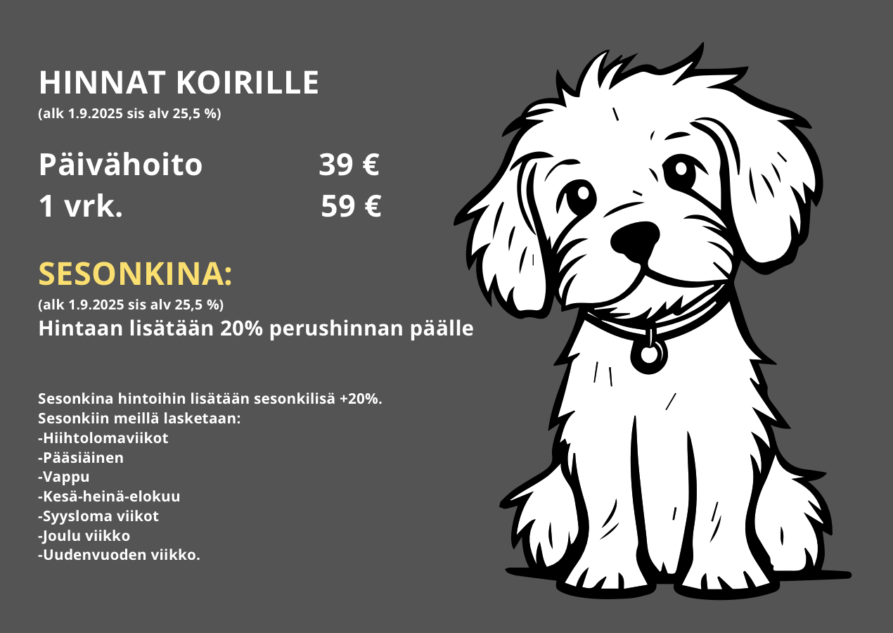 Ps. Emme ota isoja määriä koiria hoitoon yhtäaikaa. Tästä syystä suosittelemme varaamaan hoitojaksoa hyvissä ajoin. Metsästyksessä käytettäviä koiria emme ota hoitoon.